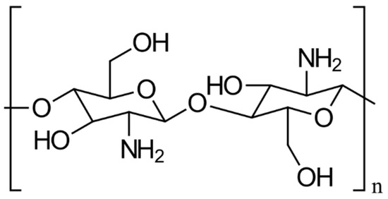 CS consists of repeating units of β-(1→4)-linked D-glucosamine and N-acetyl-D-glucosamine, as depicted in Figure 2 [3]. Its structure is analogous to that of cellulose but features an additional amino group at the C-2 position of the glucosamine units, which imparts distinctive properties to CS, facilitating chemical modifications and interactions with various molecules. The glycosidic bonds in CS, specifically β-(1→4) linkages, connect the anomeric carbon of one glucose unit to the fourth carbon of the adjacent glucose unit, contributing to its linear structure, which balances stability and flexibility. The amino group (NH2) at the C-2 position is the key functional group in CS, capable of undergoing modifications like acetylation, phosphorylation, and quaternization to adjust CS’s properties for specific pharmaceutical uses. For example, acetylation alters the amino groups by introducing acetyl groups (CH3CO-), thereby modifying CS’s solubility, charge density, and interaction capabilities. CS’s versatility is further enhanced through chemical modifications, such as grafting carboxyl, sulfate, or hydroxyl groups onto its backbone, enabling the development of CS derivatives with specific, tailored properties [3].