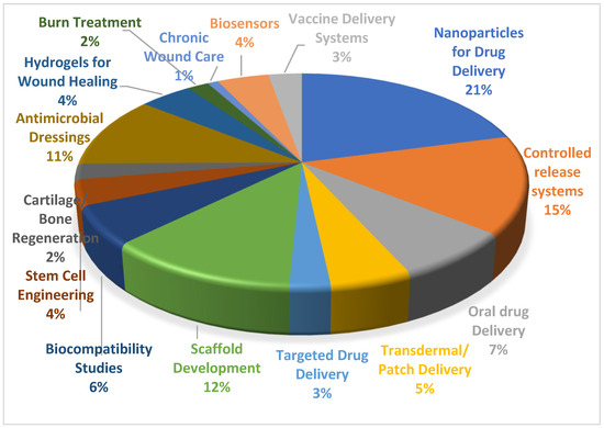 In recent years, the number of publications on chitosan derivatives has significantly increased, reflecting the growing interest in this area. According to the current data, gathered in the Web of Science database in the period of 2000–2024, there are over 5000 research articles and reviews published on the topic of chitosan and its derivatives. Out of these, a large proportion focuses on their applications in drug delivery, especially nanoparticulate drug delivery, tissue engineering, and wound healing. Figure 3 illustrates the application fields of chitosan derivatives in these articles. For researchers looking to develop new derivatives, these statistics underscore the importance of understanding the current advancements and identifying unexplored areas for innovation.