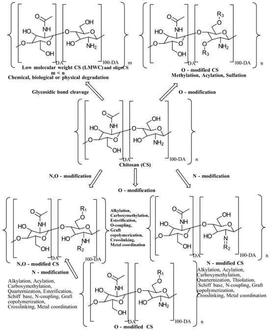 - Chen, Q.; Qi, Y.; Jiang, Y.; Quan, W.; Luo, H.; Wu, K.; Li, S.; Ouyang, Q. Progress in Research of Chitosan Chemical Modification Technologies and Their Applications. Mar. Drugs 2022, 20, 536. [Google Scholar] [CrossRef] [PubMed]