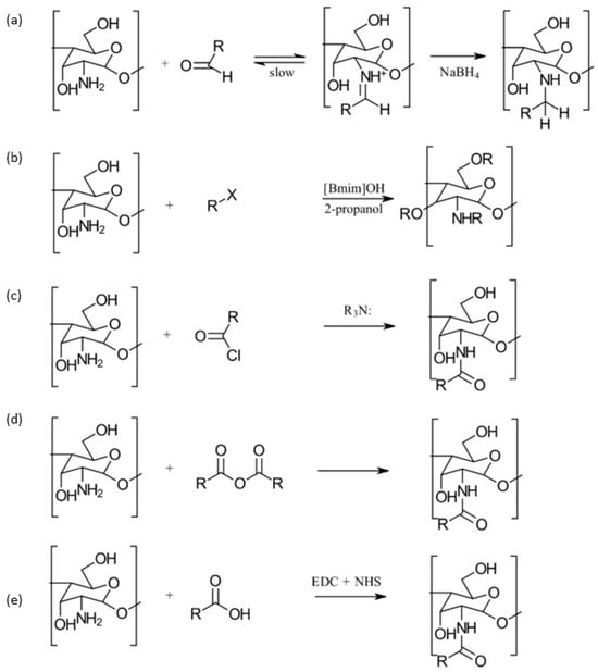A scheme depicting alkylated chitosan obtained through different chemical reactions, including (a) reductive alkylation, where an aldehyde or ketone reacts with the amino group of chitosan; (b) alkylation with haloalkanes, targeting the amino group; (c) alkylation with acyl chlorides, affecting the hydroxyl or amino groups; (d) alkylation with anhydrides, introducing alkyl groups to the amino or hydroxyl groups; and (e) alkylation with fatty acids, adding long-chain alkyl groups through esterification [14].