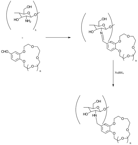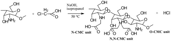 - In reductive alkylation, the -NH2 group of the CS unit reacts with the carbonyl group of aldehyde-glyoxylic acid, followed by hydrogenation with NaBH4 or NaCNBH3 to form N-carboxymethyl CS. This method specifically introduces the carboxymethyl substituent onto the N-atom without affecting the O-atom. The ratio of mono- to di-carboxymethylated glucosamine units in CS is influenced by the ratio of amine (CS) to the reagent and the reaction conditions. Muzzarelli et al. [18], who initially reported this technique, created a range of products from various types of CS with differing molecular sizes, molecular weight distributions, and degrees of deacetylation by using different quantities of glyoxylic acid.