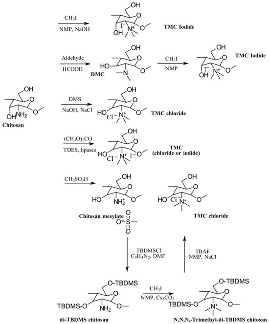 The simplest method for the synthesis of N,N,N-trimethyl chitosan (TMC) involves a one-step reaction where chitosan (CS) is treated with methyl iodide (CH3I) under strongly alkaline conditions, using N-methyl-2-pyrrolidone (NMP) as the solvent and sodium iodide (NaI) as the catalyst. This process typically results in a quaternization degree ranging from 10% to 45% [20]. Another approach, developed by Muzzarelli et al. [18], begins with the preparation of N,N-dimethyl chitosan (DMC) by reacting CS with formaldehyde in an acidic medium, followed by the addition of sodium borohydride. Methyl iodide (CH3I) is then introduced to this system to produce TMC.