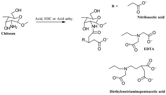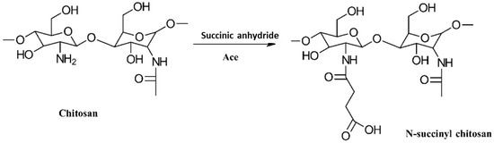 The succinylation of CS is a type of N-acylation where carboxyacyl groups are introduced by reacting with cyclic anhydrides. Specifically, the reaction of succinic anhydride with CS in dimethyl sulfoxide or acetic acid/methanol yields N-succinyl chitosan (NSC) with a controlled degree of succinylation [29]. For instance, Aiping et al. [30] synthesized NSC by first dissolving CS in 1 wt% acetic acid to achieve a 0.5% CS solution. They then dissolved succinic anhydride in acetone to produce a 1% solution, which was added dropwise to the CS solution over 30 min at room temperature. The reaction mixture was then allowed to react for 4 h at 40 °C. The reaction scheme is illustrated in Figure 9 [29].