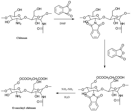 O-succinyl chitosan (OSC) is another notable succinyl derivative of CS, with properties akin to those of NSC. Since the amino groups in CS are more reactive than the hydroxyl groups, the formation of NSC is generally more common than that of OSC. Zhang et al. developed a water-soluble OSC by first protecting the highly hydrophilic amino groups with phthaloyl groups in DMF as the solvent. Following this, succinyl groups were introduced, and the phthaloyl groups were removed using hydrazine hydrate. The synthesis procedure is depicted in Figure 10 [31].