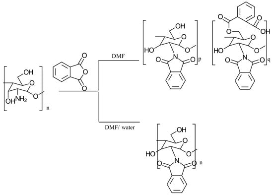In the traditional N-phthaloylation of CS, the reaction is typically conducted in N,N-dimethylformamide. Kurita’s work [40] revealed that this reaction also led to the partial phthaloylation of the hydroxyl groups. By adding a small number of hydroxyl-containing compounds as chemoselective agents, O-phthaloylation was effectively suppressed. Among the tested compounds, water was particularly effective, allowing for the selective N-phthaloylation of CS without significant O-phthaloylation. The resulting N-phthaloyl-chitosan was crystalline despite the bulky substituent, and solubility tests showed that it had a strong affinity for organic solvents. This synthesis process is depicted in Figure 12.
