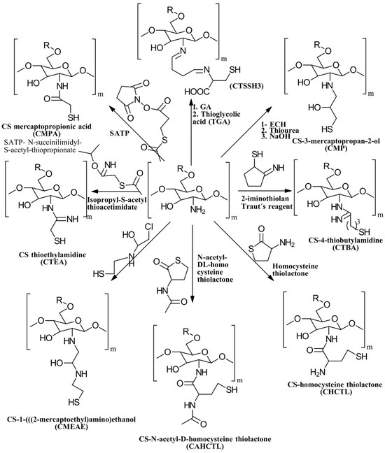 Thiolation is a method used to functionalize various polymers, including CS, by introducing thiol groups using thiolating agents. These agents include cysteine, thioglycolic acid (TGA), 2-iminothiolane, 4-thiobutylamidine (TBA), N-acetyl cysteine, isopropyl-S-acetylthioacetimidate, and glutathione [46]. This technique, initially pioneered by Bernkop-Schnürch and colleagues [47,48], is aimed at improving the mucoadhesion properties of polymers for use in pharmaceutical and biomedical applications.