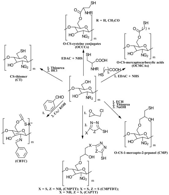 The synthesis of thiolated CS can be broadly categorized into three types based on which functional groups react with the thiol reagent: hydroxyl groups, amino groups, or both. These methods can be further divided into two main approaches: direct substitution or interaction with an SH-containing ligand. For a thorough overview of these synthesis techniques, see the reviews by Alkabli [44] and Federer et al. [45].