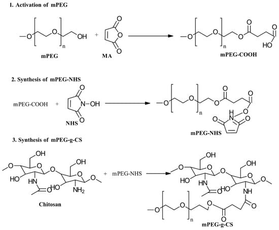 To synthesize PEGylated CS, functionalizing PEG with an appropriate end group is crucial, as shown in Figure 16 [53]. One effective approach is chemically modifying commercial PEG. Specifically, modifying the end group of α-monomethoxy ω-hydroxy-PEG creates a reactive PEG intermediate that is suitable for grafting onto CS. Various PEGylated CS products have been synthesized using different chemical modifications and PEG derivatives, such as PEG-aldehyde, PEG-carboxylic acid, PEG-carbonate, PEG-iodide, PEG-epoxide, PEG-acrylate, PEG-NHS ester, and PEG-sulfonate [54]. Most studies have focused on using methoxy-poly(ethylene glycol) (mPEG) rather than poly(ethylene glycol) (PEG) for the PEGylation of CS to prevent polymer crosslinking. In this method, the amino group of CS reacts with the active end of mPEG, while the opposite end, blocked by a methoxy group, prevents further reactions with other amines. Despite these advancements, some PEGylation reactions for PEG-g-CS can be labor-intensive and yield small amounts, which limits their scalability and routine production [55,56].