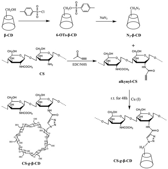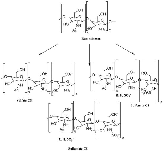 Several derivatives of CS have been synthesized through O-acylation reactions. For instance, N,O-acyl CS was prepared by using methanesulfonic acid (MeSO3H) as the solvent, which has proven effective for this process [27]. Additionally, the synthesis of O,O-didecanoyl CS and O-succinyl CS involves first creating a protected N-phthaloyl CS intermediate. This approach requires several steps: initially, the amino group is protected through phthaloylation, followed by O-acylation; finally, the removal of the protecting group is performed using hydrazine hydrate [28]. This method is complex and involves multiple stages, making it less efficient. To address these issues, a more streamlined one-pot synthesis method for the O-acylation of CS in MeSO3H has recently been developed. This new procedure simplifies the process by reducing the number of synthetic steps, thus enhancing the efficiency and making it more practical for large-scale applications [27].