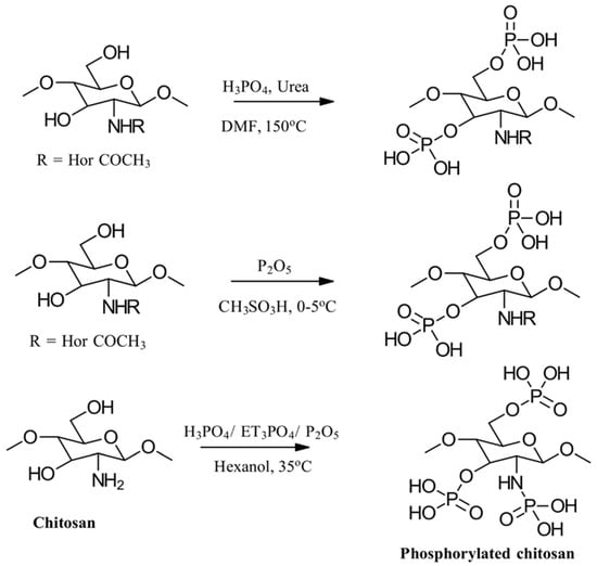 - Jayakumar, R.; Nagahama, H.; Furuike, T.; Tamura, H. Synthesis of phosphorylated chitosan by novel method and its characterization. Int. J. Biol. Macromol. 2008, 42, 335–339. [Google Scholar] [CrossRef] [PubMed]