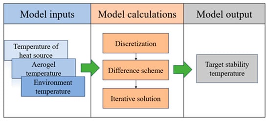 In a certain scenario, given the initial temperature of the heat source, the stabilizing temperature can be found by Equations (3)–(11). However, it can be seen from the above model that it is difficult to find an analytical solution, especially since Equation (10) are functions of spacetime and can only be solved numerically. For the above model, the method of the discretization differential format iterative solution is generally adopted for calculation. The specific steps are as follows (Figure 2).