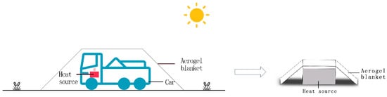 To simplify the calculation, the thermodynamic analysis software can be used directly, and the results can be obtained by simulation. The numerical analysis software used in this manuscript is the thermodynamic analysis module of Solidworks software (Solidworks 2022). Assume that the background is: the field without wind conditions, just stopped driving the vehicle parked under the aerogel thermal insulation blanket. When driving or just stopping driving the vehicle, the engine is in a heating state, the temperature is up to about 100 °C, the engine is simplified as a cubic heat source and the aerogel thermal blanket is simplified as a door-type barrier, as shown in Figure 3. The meshing method we used is based on mixed curvature, with a maximum cell size of 17.8 mm and a minimum cell size of 1.9 mm.
