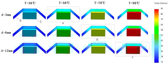 In Figure 4, the simulated heat source is placed under the aerogel insulation blanket, and the thickness of the aerogel is d, with values of 3 mm/6 mm/12 mm, the temperature of the heat source is T, with values of 30/50/70/90 degrees Celsius, and the aerogel insulation blanket is 2 cm away from the heat source. As can be seen in Figure 5, the higher the temperature is, the darker the color of the heat source, and the aerogel is displayed, which is used to visually represent the surface temperature of the object. When the thickness of the aerogel is kept constant, with the increase in the heat source temperature, the temperature of the aerogel directly above the heat source increases, but the overall thermal insulation effect is better. When the heat source temperature reaches 90 °C, the aerogel surface temperature is only 43.1 °C (Figure 5c); when the heat source temperature is kept constant, and the thickness of the aerogel increases, the surface temperature of the aerogel decreases, which is in line with Formulas (3)–(10).