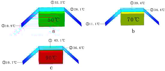 (a–c) Simulation calculation results. (a) Simulation results when the heat source temperature is 50 °C; (b) Simulation results when the heat source temperature is 70 °C; (c) Simulation results when the heat source temperature is 90 °C.