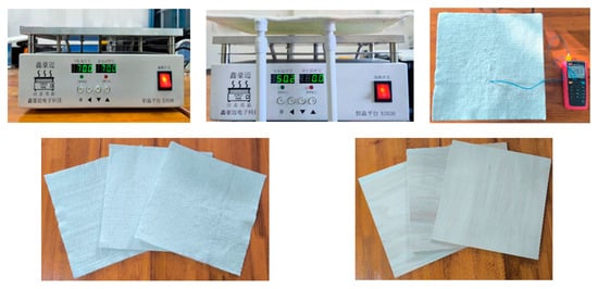 The model of the aerogel thermal insulation effect was obtained by the theoretical derivation and simulation solution in the previous section, and in order to test its accuracy, the following is verified with an experiment. Experimental design: in a closed room, using a constant temperature heating table, the aerogel insulation blanket is heated, the distance between the aerogel and the heating table is adjusted and the temperature of the aerogel is measured; the whiteboard is used for the control experiments at the same time (Figure 6). The confined space is to ensure constant temperature and pressure and isolate the environmental interference, the constant temperature heating table is used to simulate the heat source, and a conduction thermometer is used to measure the surface temperature of the aerogel and observe its real-time changes. The constant temperature heating table uses the resistance to heat and the use of a temperature control system to regulate the temperature, with an accuracy of 0.1 °C, above the thermally conductive surface for the 6061 aluminum alloy, which has a size of 30 cm × 30 cm. White boards are taken from the commonly used building materials linden boards, with moderate linden hardness and a density of 500 kg/m3; the de-lignification of the wood treatment improves compression, but also makes the cellulose hydroxyl groups exposed to the formation of grafting anchor points, which in turn improves its fire retardant and thermal insulation properties [26].