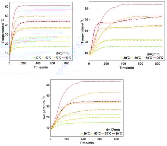The temperatures of the heat source and the aerogel after heat exchange stabilization are given in detail in Table 3. It can be found that the thickness of the aerogel has less influence on heat exchange, and the difference between the average temperatures of 3 mm thick and 12 mm thick aerogel after stabilization is only 2.1 °C when the heat source temperature is 30 °C, and the temperature difference is only 11.7 °C even when the heat source temperature is 90 °C. Considering the application point of view, the selection of thermal insulation or anti-IR reconnaissance material is not better the thicker the aerogel thermal insulation blanket is. Combined with Figure 5, the highest temperature of the aerogel surface at the time of stabilization is at the center point directly above the heat source; when the heat source temperature is lower, the highest temperature of the aerogel is close to that of the heat source, and when the heat source temperature is higher, the difference between the highest temperature of the aerogel and the temperature of the heat source is larger, so it can be seen that the higher the temperature of the heat source is, the better the thermal insulating effect of the aerogel is.