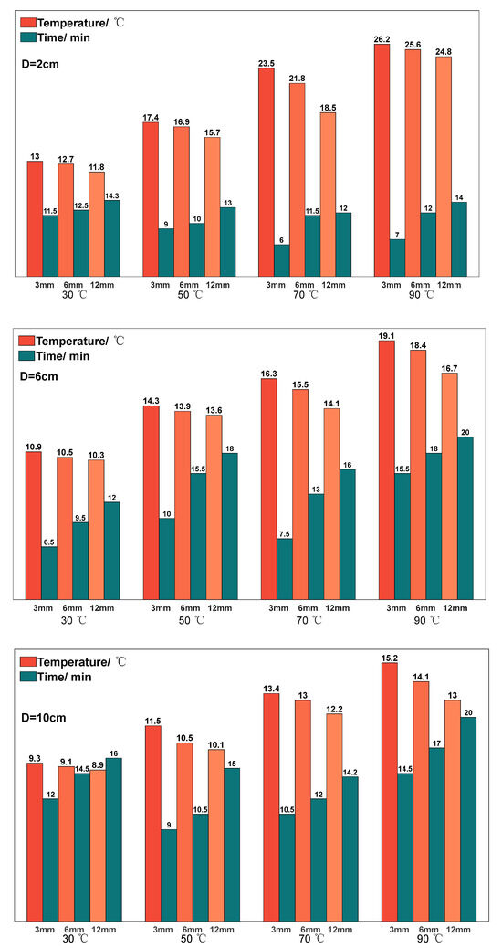 The distance between the aerogel and the heat source was adjusted by raising or lowering the height of the support bar in the range of 2–10 cm, and the temperature of the aerogel after stabilization was again observed. Figure 8 shows the stabilized temperature and stabilization time of the aerogel when the temperature of the heat source is 30/50/70/90 °C and the distance is 2/6/10 cm. It can be found that the higher the temperature of the heat source, the higher the stabilized temperature and the higher the stabilized time of the aerogel. Compared to Figure 7, the stabilized temperature of the aerogel decreases dramatically in the case of having the same heat source and aerogel thickness; for example, when the temperature of the heat source is 50 °C and the thickness of the aerogel is 6 mm, the stabilized temperature of the aerogel when it is placed on the heat source directly is 21.2 °C, and the stabilized temperature of the aerogel when the aerogel is elevated by 2 cm is decreased to 16.9 °C. When the distance between the aerogel and the heat source reaches 10 cm, the stabilized temperature of the aerogel is close to the ambient temperature even if the temperature of the heat source is 90 °C, which fully demonstrates that the thermal insulation effect of the aerogel is better and the distance between the aerogel and the heat source has a greater effect on the thermal insulation effect of the aerogel. It can also be found that the thermal equilibrium time of the aerogel heat insulation blanket is more stable, and the stabilized temperature can be reached in about ten minutes, which is suitable for rapid heat insulation, cooling and other scenarios.