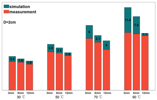 Keeping the distance between the aerogel and the heat source at 2 cm, the stabilized temperatures of the aerogel obtained by the model simulation are shown in Table 3. The average value is taken to be compared with the experimental results, and the mean absolute error (MAE) obtained is 3.85, which is a value that indicates that the model is more accurate and can be used for the theoretical derivation related to the prediction of the temperature of the aerogel and so on. Observing Figure 9, the temperature difference between the model and the experiment is generally below 10 °C, and the larger temperature difference for the case of the heat source temperature is 90 °C with an aerogel thickness of 3 mm, and the lower the heat source temperature, the more the model agrees with the experimental results, which indicates that the model has better accuracy for the temperature of the heat source in the range of room temperature. In addition, the stabilized temperatures of the aerogels measured in the experiments were lower than those predicted by the model, which may be attributed to the following reasons: firstly, the ambient temperatures varied with the experiments, fluctuating around 10 °C; secondly, the contact thermometers used for temperature measurement had temperature loss during heat conduction [27,28,29], resulting in the measured temperatures being lower than the actual temperatures.