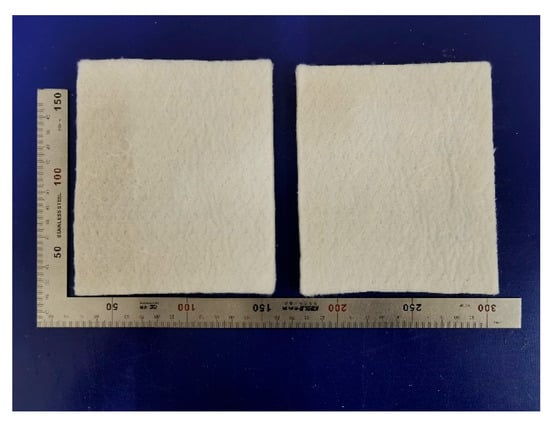 For model solving, the thermal conductivity of the aerogel needs to be determined, and we procured commercially available silica aerogel and tested its thermal conductivity using Hot Disk. The aerogel was purchased from the market in December 2023 from Namet New Materials Technology Co., LTD., Shanghai, China. Silica aerogels are poorly machinable and their practical applications are severely hampered because of their inherent brittleness and low strength, so fibers are commonly used to reinforce silica aerogels to generate composites [30]. The aerogel shown in Figure 10, a silica aerogel insulation blanket, is a combination of nano-aerogel and inorganic fibers with soft, environmentally friendly and easy-to-construct thermal insulation. For testing its thermal conductivity, the size of the sample was 12 cm × 12 cm.