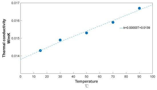 The experimental results are shown in Table 4, experimentally measured thermal conductivity of the aerogel thermal insulation blanket is as low as 0.0143 W/mK (15 °C) and as high as 0.0167 W/mK (90 °C), so the thermal conductivity of the aerogel at room temperature can be considered to be around 0.015 W/mK, and the relationship between the fitted thermal conductivity and temperature is (Figure 12):