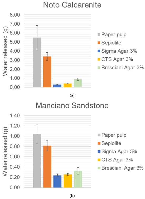 For what concerns the role of Japanese paper, there is a sort of “barrier effect” by the Japanese paper, more evident for Noto stone. In fact, looking at the histograms in Figure 6a,b, it is possible to assess the effect of the presence of Japanese paper, which brings a heavy reduction of the water release from 18 to 76%, depending on the stone and on the agar used. Bresciani agar is more sensitive to the presence of Japanese paper.