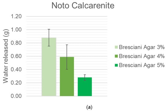 For what concerns gels, the water release is a linear function of agar concentration (see Figure 3a–c). By increasing the agar concentration from 3% to 5%, the water release lowers by a third; in particular, an increase of 1% in the agar concentration induces a decrease in water release in the range 16.98–66.88 g depending on the stone: the increase from 4% to 5% is more obvious with respect to the one from 3% to 4%; this effect could be due to the greater hampering of the polymeric chains, influencing the water transport. This consideration is evident when looking at Noto and Manciano. Once again, the results of the very low porosity black limestone should not be considered reliable.