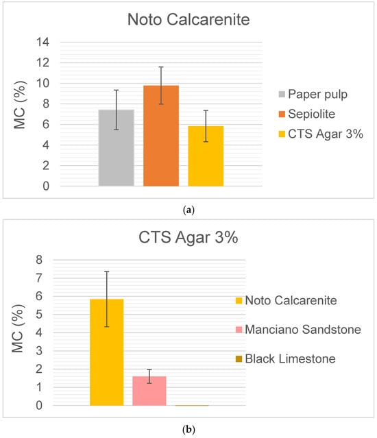 (a) Noto calcarenite Moisture content (MC%) after water release by traditional and CTS Agar 3%. (b) Comparison of the moisture content (MC%) released on the three different stones. (c) Comparison of the water released by CTS Agar 3% on the three different stones.