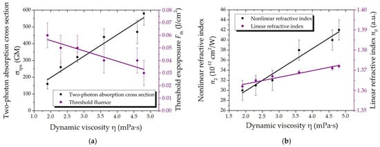 Figure 2. Dependences of the main optical parameters on dynamic viscosity: (a) Two-photon absorption cross section and threshold fluence; (b) Nonlinear and linear refractive indices.