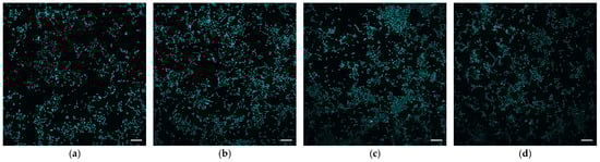 Figure 6. Fluorescence microscopy images of cells after 72 h of cultivation on biocomposite samples: (a) Control (clean cover glass); (b) Sample 1 (5 layers); (c) Sample 1 (4 layers); (d) Sample 2 (5 layers). Bar is 100 µm.