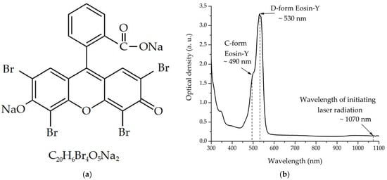 A GENESYS 50 UV-Vis-Nir spectrophotometer (Thermo Fisher Scientific, Waltham, MA, USA) was used to estimate the optical density of the obtained dispersed hydrogel media. The spectrum was recorded at wavelengths between 300 and 1100 nm, with an increment of 2 nm. During the research, a quartz cuvette with an optical path length of d = 1 mm was used. Figure 7 shows data for sample 1 containing eosin-Y (Figure 7a) as a photoinitiator. In the two-photon absorption window (520–540 nm) for the 1070 nm laser line, the values of the linear absorption coefficient α reaches 75 cm−1, which indicates that this spectral range is of a significant sensitivity. At the excitation wavelength, the α values are less than 2 cm−1, which indicates insignificant one-photon absorption of such radiation. The spectrum is dominated by the absorption bands of eosin-Y (Figure 7b) associated with dianions of the D-form of eosin (λmax~530 nm) and its cations of the C-form (λmax~490 nm).