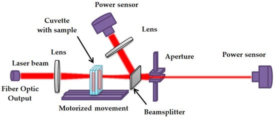 In order to estimate the two-photon absorption cross section, an optical scheme was constructed that allows measurements using the Z-scan method. Figure 8 shows this configuration. The HTTP MARK MOPA laser system (Bulat Design Bureau, Moscow, Zelenograd, Russia) based on an ytterbium fiber laser was used to generate pulses. The pulses emitted by the laser passed through a lens to focus the radiation and achieve intensity sufficient for the manifestation of nonlinear effects. The sample was then placed in a holder fixed on a motorized stage N31.100E (CoreMorrow Ltd., Harbin, China) with a controller E71.D4E-H (CoreMorrow Ltd., Harbin, China) to move it along the direction of the beam up to the location of the second lens. Subsequently, an aperture is positioned behind the aforementioned component, after which a G5F-GT-10 power sensor (ShenZhen CaiHuang Thermoelectricity Technology Co. Ltd., Shenzhen, China) is installed.