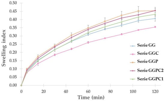 The results of the swelling test are presented in Figure 2 with swelling profiles. The swelling behavior of a polymer is essential for its cohesiveness with the water uptake of the dosage form [11]. For all series, no weight loss was observed throughout the study, i.e., there was no damage to the globules. It can be observed that the longer the test time, the higher the swelling index. The most significant difference in swelling behavior was observed within the first 30 min of the test.