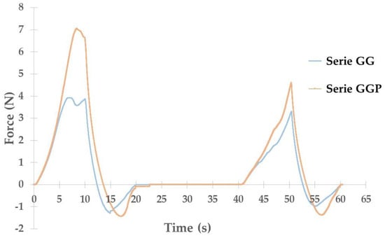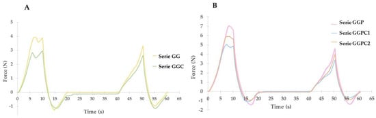 The figure shows that replacing part of the glycerin portion with PEG 400 resulted in an increase in the stiffness of the globules. An increase in the force needed for the first compression from approximately 4 to 7 N was observed. In the next stage of the test (second compression), the required force did not differ that much: for globules made of traditional GG mass it was about 3.5 N, while for globules with the addition of PEG 400 (GGP base) it reached a value of about 4.5 N. It can also be observed that, for the GG base, the differences in both compression stages do not differ significantly: they reach approximately 4 and 3.5 N, while for the base with the addition of PEG 400, these two stages require forces of 7 and 4.5 N, respectively. It can be seen that the presence of PEG 400 stiffens the structure of the suppository base. At the same time, it can be said that the GG mass is a base that maintains its mechanical properties regardless of external mechanical influences. Further comparisons assessing the impact of the presence of CLO suspended in the medium on its mechanical properties are shown in Figure 4.