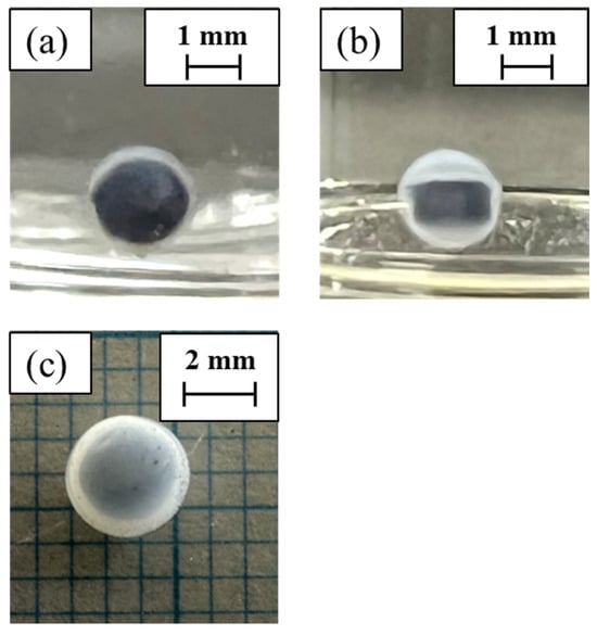 We will now describe Method A. We succeeded in preparing an AC-encapsulated BC gel with an improved volume per unit volume compared to previously reported gels. The maximum AC content in agar was 20 wt%. This result is because the viscosity of the agar solution increases with increasing AC content. As the amount of AC increased, the particles increasingly came into contact with each other. This result caused the water to lose its fluidity, become more viscous, and turn muddy. In this state, it could no longer be formed into a sheet and could not be hollowed out. As shown in Table 1, the amount of AC encapsulated per unit volume of the AC-encapsulated BC gel was successfully increased. Compared to the previous gel, which had a density of 35.3 [µg/mm3], we succeeded in preparing gel with a density of 65.1 [µg/mm3], which is approximately 1.84 times higher. However, when culturing was performed using the cylindrical agar gel as a nucleus, the BC gel membrane was sometimes torn at the edge of the cylinder during washing or in the process of removing the agar gel by heating and dissolving it. This result is because the agar gel that acts as the nucleus during culture has edges. When the gel was observed from the side after encapsulation with the BC gel, it was found that the thickness of the gel at the edges was thinner than that of the other parts (Figure 1b). In order to culture the BC membrane uniformly, it is necessary for the culture medium to adhere uniformly to the gel of the culture nucleus. Therefore, we decided to mold the agar gel nucleus into a spherical shape and culture it.