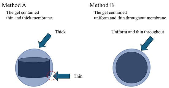 There are two possible factors for this result. The first factor is the change in the shape of the gel nucleus inside. As shown in Figure 2, when the gel nucleus inside is cylindrical, there is a thick part of the BC gel membrane (Figure 2, Method A). This part does not contain AC, so the amount of AC contained per volume of the ACEG decreases. On the other hand, when the gel nucleus is spherical, a thin and uniform BC gel membrane is produced. Therefore, the ACEG with a small volume and packed with AC is produced (Figure 2, Method B).