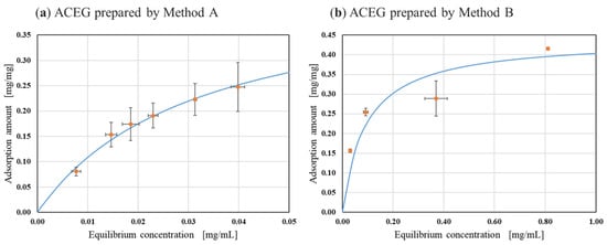 The relationship between each equilibrium concentration of ACEGs and the saturated adsorption amount is shown in Figure 3 for the measurement results of the gels of Method A and Method B.