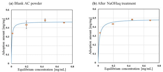 Adsorption isotherms of AC powder. The orange plots are experimental values. The blue line is the curve fitted to the Langmuir equation using the parameters in Table 3 (n = 3).
