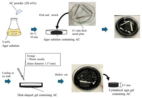 In the previous preparation method, spherical alginate gel (Ca-Alg gel) was used. In this method, alginate reacts with calcium ions to form a cross-linked structure, producing a spherical gel containing AC. Therefore, it is necessary to drop a suspension of sodium alginate with AC into an aqueous calcium chloride solution. Aqueous sodium alginate solutions are highly viscous. The viscosity is further increased by the addition of AC. Therefore, increasing the AC content clogged the chips in the dripping procedure. This action made it difficult to increase the amount of AC encapsulated. Therefore, a preparation method using agar gel was used. There are two new methods. The main difference is the shape of the agar gel used. Method A uses agar gel cut into a cylindrical shape. Method B uses agar gel prepared into a spherical shape. The two methods are described in detail below. Agar is a kind of seaweed polysaccharide with gelatinizing ability and is mainly extracted from the Gracilariaceae and Gelidiaceae families [23]. Currently, agar is used in a wide range of applications, including food, pharmaceuticals, nutraceuticals, and biomedical applications [24]. When the agar solution is cooled, the agar molecules change from a linear to a double-helical shape, forming a stable three-dimensional network structure with increased hydrogen bonds. As the temperature drops further, the double helix coalesces to form a rigid gel [25,26,27]. The above mechanism allows agar to control its gel state and liquid state depending on the temperature. The agar solution in a heated state has a lower viscosity than the alginate solution. Therefore, it was suggested that ACEGs containing more AC than previous methods could be prepared. There are other advantages to changing from a Ca-Alg gel to an agar gel, such as the effect of ions. In the conventional method, a sodium alginate solution mixed with AC powder was dropped into a calcium chloride solution to form a Ca-Alg gel, which was then used as a nucleus for culture. After the BC gel membrane was produced, the Ca-Alg gel was dissolved and removed with a phosphate-buffer solution. In this method, the AC encapsulated in the ACEG comes into contact with various ions. This result suggests that the adsorption capacity of AC may be affected by ions. However, this is not necessary in the case of agar gel. As mentioned above, agar gels cause liquefaction and gelation depending on the temperature. Therefore, in the case of the method using agar gel, it is possible to prepare an AC-containing gel simply by changing the temperature. We theorized that the procedure for removing the internal gel after the production of the BC membrane could also be easily performed by using hot water. This action leads to fewer ions coming into contact with the AC. Thus, the effect of ions on the AC can be reduced. This action would increase the saturated adsorption of AC encapsulated in the ACEG and improve the performance of the ACEG as an adsorbent. For these reasons, agar gels were used for the new preparation method.