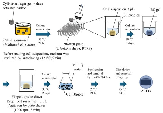 First, agar gel was prepared as the nucleus for culture. The procedure is shown in Figure 5. AC powder was added to a 5 wt% agar solution. The solution was heated and stirred to dissolve the agar and then spread onto a Petri dish. The mixture was then pressed down from above, using a Petri dish with a 0.5 mm thick metal plate attached, and rapidly cooled. The obtained plate-shaped agar gel was hollowed out with a plastic needle (inner diameter 1.37 mm) to prepare a cylindrical agar gel containing AC. Next, agar gel was used as a nucleus for culture. The procedure is shown in Figure 6. The medium was sterilized by autoclaving, and K. xylinus was cultured at 30 °C for 3 days. The agar gel was soaked in a suspension of cultured cells, and K. xylinus was cultured at 30 °C for 1 day. Half the volume of silicone oil was poured into each well of a U-bottom 96-well plate (made of PTFE), and the spherical agar gel with the cell suspension remaining on the gel surface was immersed in it. While maintaining this condition, K. xylinus in the cell suspension was cultured at 30 °C for 1 week. On the first day of culture, 3 µL of the K. xylinus suspension was dropped onto the gel. On the fifth day of culture, the gel was turned upside down, and 3 µL of the K. xylinus suspension was dropped onto the gel, followed by agitation using a plate shaker (1000 rpm, 3 min). The addition of cell suspension was carried out on the 1st day and after 5 days of culturing. The suspension was the same one as the initial cell suspension soaked with the gels. After removing the BC gels biosynthesized at the surface of the culturing Petri dish, only the medium was used. After culturing the BC gel membrane, the gel was immersed in 1 wt% of NaOHaq to kill and remove the K. xylinus. Furthermore, Milli-Q water and the gel were placed in a covered Erlenmeyer flask and then left to stand in a small environmental tester at 95 °C for 24 h. This method removed the agar gel.
