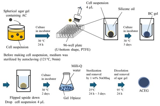 The method for preparing spherical agar gel is shown in Figure 7, and the method for preparing ACEG using the gel is shown in Figure 8. Each well of a U-bottom 96-well plate (made of PTFE) was filled with silicone oil and placed on a metal tray. A 10 µL aliquot of 20 wt% AC-agar suspension (19 g Milli-Q water, 1 g agar, 5 g AC) containing the adsorbent suspended in it was dropped into each well. After heating in a small environmental tester at 120 °C for 30 min, the well plate was transferred to an ice bath and left to stand for 90 min. Using this method, spherical agar gels containing AC were prepared. The resulting agar gel was washed with Milli-Q water. The medium was sterilized by autoclaving, and the K. xylinus was cultured at 30 °C for 3 days. The spherical agar gel was immersed in a suspension of cultured cells, and the K. xylinus was cultured at 30 °C for 1 day. The spherical agar gel with the cell suspension remaining on its surface was immersed in each well of a U-bottom 96-well plate filled with silicone oil. While maintaining this condition, the K. xylinus in the cell suspension was cultured at 30 °C for 1 week. On the first day of culture, 4 µL of the K. xylinus suspension was added dropwise. On the fifth day of culture, the gel was turned upside down, and 4 µL of the K. xylinus suspension was dropped onto it. The addition of cell suspension was carried out on the 1st day and after 5 days of culturing. The suspension was the same one as the initial cell suspension soaked with the gels. After removing the BC gels biosynthesized at the surface of the culturing Petri dish, only the medium was used. After culturing the BC gel membrane, the K. xylinus were killed in the same manner as in Method A, the agar gel nucleus was removed, and the ACEG was obtained.