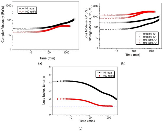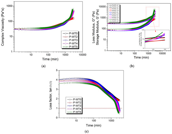 Complex viscosity (a), storage and loss modulus (b), and loss factors (c) of the P-WT3-H80-24 at different frequencies with respect to the time.