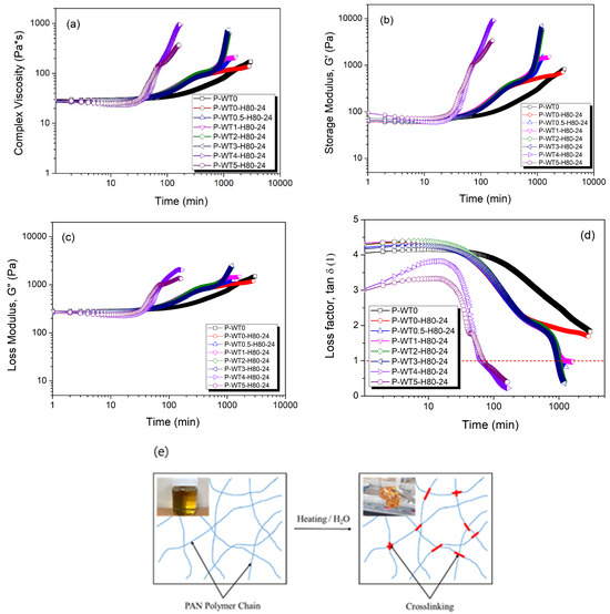 Complex viscosity (a), storage modulus (b), loss modulus (c), and loss factors (d) of the heat-treated samples with different moisture contents with respect to the time. A schematic of the gelation behavior (e) of PAN/DMSO solutions.