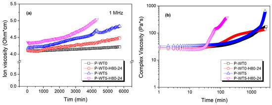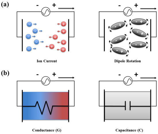 Dielectric analysis can be used for the real-time investigation of the degree of curing of dielectric materials. The conductivity (σ) and permittivity (ε) arising from ion currents and dipole rotations were measured, respectively, as shown in Figure 4a. Typically, the mobile ions in polymers are impurities or additives and separated slightly positive and negative charges produce the dipoles. Generally, when an electric field is applied to a dielectric material, the flow of ions causes a current. σ is inversely related to the resistivity (ρ), whereas the effect of mobile ions is related to the conductance (G), as shown in Figure 4b. The conductance is also frequency dependent. For instance, ion transport is easy in a material with low viscosity but becomes more difficult with increasing viscosity [33,34,35,36,37]. Specifically, when the complex viscosity of a curable polymer increases, the ionic viscosity increases correspondingly, resulting in a decrease in the ionic current. Therefore, the effects of dipoles and ions can be separated and distinguished using a dielectric analysis. Ionic viscosity is the reciprocal value of the ionic conductivity, which is calculated from the dielectric loss factor. Normally, ionic conductivity measures the extent to which mobile ions in a polymer solution can transmit charge, and it is, therefore, closely related to electrical conductivity. Unlike low molecular weight electrolytes or ionic gases, ionic conductivity in polymer solution specifically reflects the ion mobility within the polymer structure, which is based on the activity and mobility of specific ions within the polymer. Therefore, it can serve as a crucial metric for evaluating the electrochemical properties and electrical conductivity of the polymer solutions. Ionic conductivity in polymers is typically defined as the reciprocal of resistance. Therefore, a higher ionic conductivity indicates that the polymer’s mobile ions can effectively transmit the charges [33,34,35].