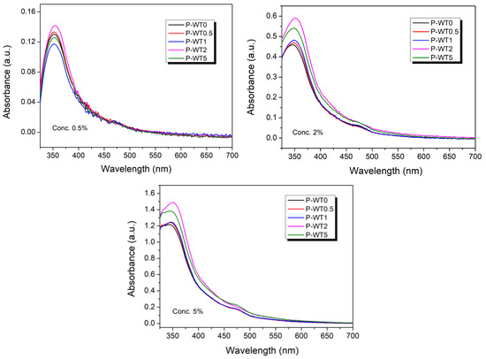 To confirm the degree of aging of the heat-treated PAN/DMSO solutions with different moisture contents, spectrometry measurements were carried out in the visible region (300–700 nm), and the results are shown in Figure 6. The height of the absorbance peak increased with increasing moisture contents, indicating a color change in the polymer solution. The structural change of the PAN polymer is likely a result of the formation of physical or chemical crosslinks in the gel due to the moisture contents and heat treatment. Moreover, it was also observed that the intensity of the absorbance peak observed in the UV-visible absorption spectra of PAN solutions increased with an increasing moisture content, which is attributed to the characteristic n→π* transition of the C≡N bond. This transition is sensitive to the presence of impurities, such as water or hydroxyl groups, affecting the electronic properties of the C≡N bond.