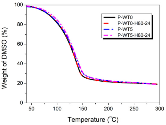 TGA measurements were performed to determine the content of residual solvent in the PAN solutions. As shown in Figure 7, the solvent was rapidly volatilized up to approximately 150 °C (Figure 7). Above 150 °C, the weight of solvent was plateaued, suggesting that the solvent molecules were strongly bound to the nitrile groups of the polymer. The PAN polymer with the nitrile (-C≡N) groups possesses a polarity. These nitrile groups exhibit polarity due to the electronegativity of nitrogen, resulting in a partial positive charge on the carbon atom. Meanwhile, solvents such as DMSO (dimethyl sulfoxide) and DMF (dimethylformamide) are also polar aprotic solvents. Although they lack acidic protons, they have a polar structure that enables them to form strong hydrogen bonds with polar functional groups. Thus, the nitrile groups in PAN can engage in such interactions with these polar solvent molecules, forming hydrogen bonds. These interactions promote the solvation of PAN polymer, thereby increasing PAN’s sensitivity to solvent absorption and overall solvent interactions. This suggests that PAN solutions can undergo structural changes in PAN/DMSO solution at high temperatures, particularly when interacting with specific solvents [9,11]. Therefore, compared to the solvent molecules, the motion of the polymer chains is restricted even at high temperatures, whereas the motion of solvent molecules increases at increasing temperatures. Further, the nitrile groups in the polymer are polarized, and consequently, the repulsion between adjacent nitrile groups is enhanced. Therefore, PAN undergoes gelation and results in a change to a helical polymer structure [23,24].