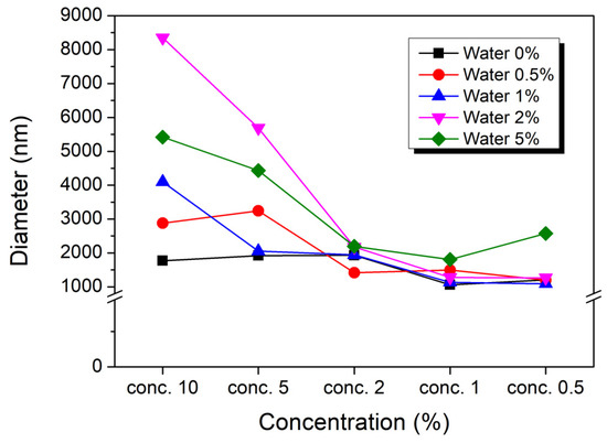 Small particles dispersed in a solution are subject to Brownian motion, where smaller particles move faster while larger particles move more slowly. In this study, dynamic light scattering (DLS) measurements were employed to monitor the size distribution of gel particles within PAN/DMSO solutions, as shown in Figure 8. To achieve consistent measurements, PAN/DMSO solutions at various concentrations (0.5% to 20%) were diluted. In solutions with the highest moisture content, microparticles exhibited the largest size, approximately 3 μm, while particle size decreased progressively as PAN concentration decreased. This result highlights a clear relationship between polymer concentration and particle size, suggesting that higher PAN concentrations facilitate gelation and aggregation, leading to the formation of larger particle structures. The formation of small, irregular gel particles can be attributed to the physical gelation process, where PAN polymer chains create an interconnected network. Differences in the orientation and interaction strength of nitrile (-C≡N) groups within PAN contribute to variations in particle size and shape, as molecular interactions are not uniformly distributed throughout the solution. Furthermore, hydrogen bonding between water molecules and PAN’s nitrile groups significantly influences intermolecular interactions, introducing additional structural irregularities within the gel network as the interactions vary spatially. It has been previously reported that aging time also affects microparticle size, with longer aging times resulting in larger particle sizes even at the same concentration [41,42,43,44,45,46]. This phenomenon can be attributed to the progressive aggregation and crosslinking of polymer chains over time as the gelation advances and the polymer network becomes denser. Additionally, dilution led to smaller particles, likely due to the partial dissolution of physical gels as the polymer concentration decreases and the solvent concentration increases. This dilution weakens the gel network, reducing particle size by diminishing gel integrity and limiting crosslinking opportunities among polymer chains [47,48,49].