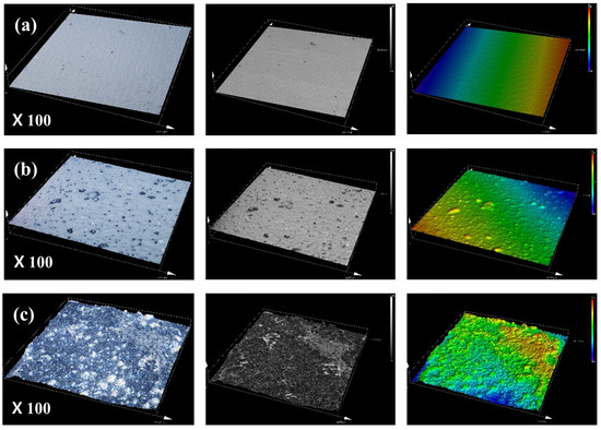 The 3D laser confocal microscope with a short-wavelength laser was employed to capture high-resolution, non-contact, and non-destructive images of the PAN polymer surface. This method facilitated precise measurement of surface roughness and 3D morphology across scales from nanometers to millimeters, offering detailed insights into the microstructural changes within PAN films under varying moisture conditions. Measurements were conducted at ×100 magnification over 3 to 4 h following solvent volatilization at room temperature. The micrographs in Figure 9 display reflected colors, which may not represent the true color of the polymer surface. Surface roughness analysis showed that PAN films exposed to elevated moisture and heat treatment exhibited significantly higher roughness compared to untreated films. This increase in roughness is attributed to the formation of small gel particles within the polymer matrix, likely driven by intensified intermolecular interactions and crosslinking in high-moisture environments. The observed rise in surface roughness with increased moisture content suggests that moisture is crucial in promoting gel particle formation, thereby influencing the morphological complexity and network density within PAN films. Further structural analysis indicates that moisture and thermal conditions significantly impact the internal organization of the PAN polymer matrix, fostering a more interconnected and textured structure. These findings provide valuable insights into the gelation mechanisms in PAN solutions, underscoring the role of environmental factors, particularly moisture, in shaping the morphological and structural characteristics of the polymer during film formation [47,48].