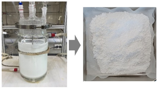 Photographs of the reactor used for the suspension polymerization of PAN polymers (left) and the obtained product powders (right).