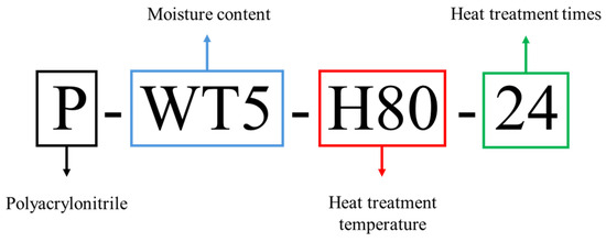 To prepare powdered PAN, the suspension polymerization method was used. The photographs of the reactor used for the suspension polymerization and the obtained product powders are shown in Figure 10. For polymerization, the concentrations of acrylonitrile (AN, Sigma–Aldrich, St. Louis, MO, USA) and itaconic acid (IA, Daejung Co., Gwangju, Republic of Korea) were fixed at 98% and 2%, respectively. The reason for using 2% IA was to introduce carboxylic acid groups into the polymer chains, which could improve the solubility of the resulting polymer in water and other polar solvents. To initiate the redox polymerization, ammonium persulfate (APS, Daejung Co., Republic of Korea) and sodium bisulfite (SBS, Daejung Co., Republic of Korea) catalysts in DMSO (Sigma–Aldrich, St. Louis, MO, USA) were used. The reaction temperature was fixed at 55 °C. After synthesis, as-prepared PAN powders were washed with distilled water and dried in a vacuum oven at 80 °C for 24 h. The obtained PAN polymer was dried again in a vacuum oven at 45 °C for 24 h before being used to remove moisture. The PAN solution (~20 wt%) in DMSO was prepared using a mixer (AR-100, THINKY INC., Laguna Hills, CA, USA). In this study, DMSO was selected as the solvent to investigate the gelation behavior of PAN solution due to its unique properties that facilitate controlled gelation studies. While N,N-dimethylformamide (DMF) is commonly used in PAN processing, DMSO’s high polarity allows for stronger dipole–dipole interactions with PAN’s nitrile groups, yielding homogeneous solutions essential for precise gelation analysis. Additionally, DMSO’s superior thermal stability under high-temperature conditions (e.g., 80 °C) minimizes premature degradation, supporting consistent assessments across varied experimental conditions. DMSO also offers a safer toxicity profile than DMF, making it suitable for laboratory and industrial applications, particularly in carbon fiber precursor research. These factors collectively establish DMSO as an effective alternative for in-depth PAN gelation studies. To determine the effect of the moisture content (WT), various water contents (0–5%) were added to the prepared PAN polymer solutions and named as P-WTx and P-WTx-H80-yy, corresponding to the moisture content (WTx) and time of heat treatment at 80 °C (H80-yy), respectively. Here, P-WT4 means that moisture content is 4 wt%. P-WT1-H80-24 means that moisture content is 1 wt%, and the sample is heat-treated at 80 °C for 24 h (Figure 11). The detailed compositions of each PAN solution are listed in Table 3.