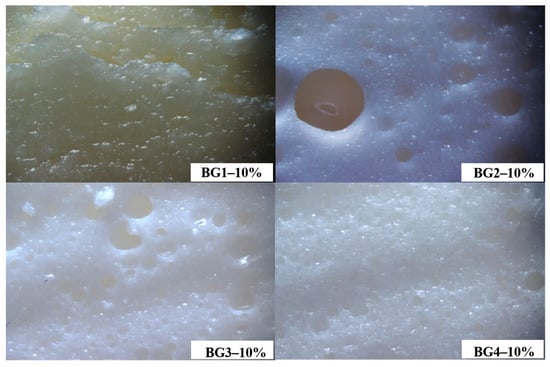 Upon emulsification, the BG composed of 20% hydrogel and 80% oleogel, displayed phase separation. This phase separation occurs during heat treatment, which triggers the release of loosely bound wax within the protein network. Statistical analysis of BG1–10%, BG2–10%, BG3–10%, and BG4–10% bigels revealed significant differences due to the increased hydrogel phase (H-phase), yielding final protein concentrations of 2.18%, 4.36%, 6.55%, and 8.72%, respectively (Table 1). Higher protein content produced a densely packed network with numerous small voids or pores (Figure 2). The formation and stabilization of the foam are likely attributed to ovomucins, the EWPs that readily lose their globular structure during heat treatment [26].